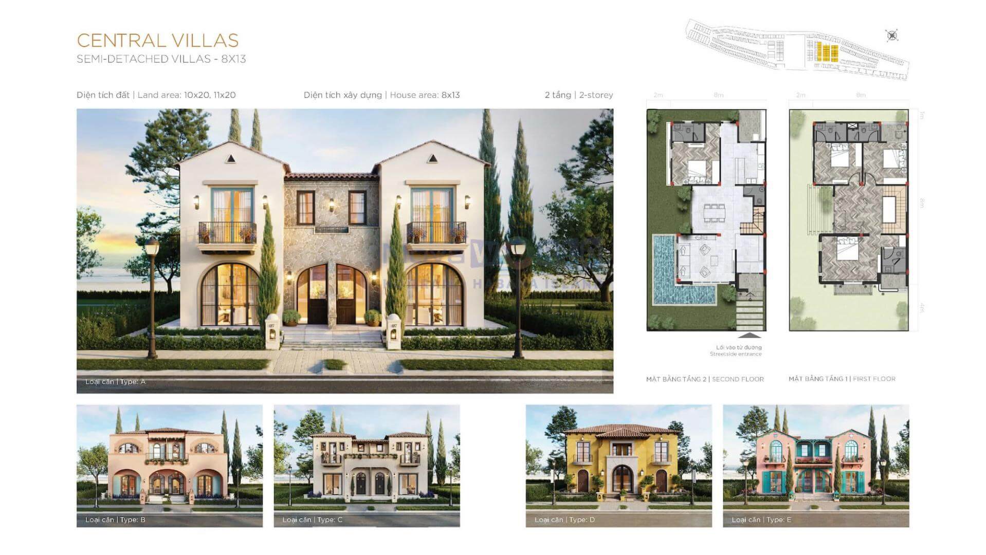 Phiên bản rộng rãi hơn của dòng song lập là Semi-Detached Central Villa với kích thước 11x20m. Được xây dựng trên diện tích đất 220m² và diện tích sàn sử dụng 218m², dòng sản phẩm này gây ấn tượng bởi kiến trúc hai khối nhà độc lập liền kề và đối xứng nhau qua trục tường chung. Sự kết hợp này tạo nên vẻ ngoài tựa như một dinh thự lớn, khẳng định vị thế và gu thẩm mỹ sang trọng của gia chủ.
