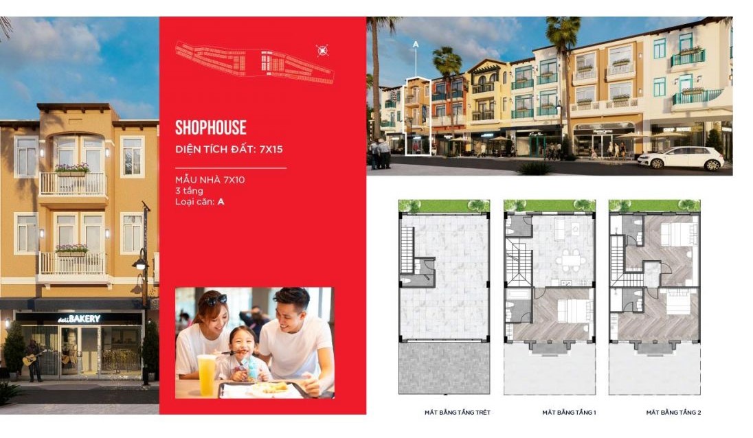 Mở đầu cho nhịp sống sôi động tại đây là dòng sản phẩm Shophouse với kích thước tiêu chuẩn 7x15m. Mỗi căn được xây dựng trên diện tích đất 105m² với tổng diện tích sàn sử dụng 225m², tọa lạc tại những vị trí đắc địa. Thiết kế này nhằm mục đích đón trọn dòng khách du lịch, giúp chủ sở hữu tối ưu hóa hiệu quả kinh doanh thương mại kết hợp với nhu cầu lưu trú.