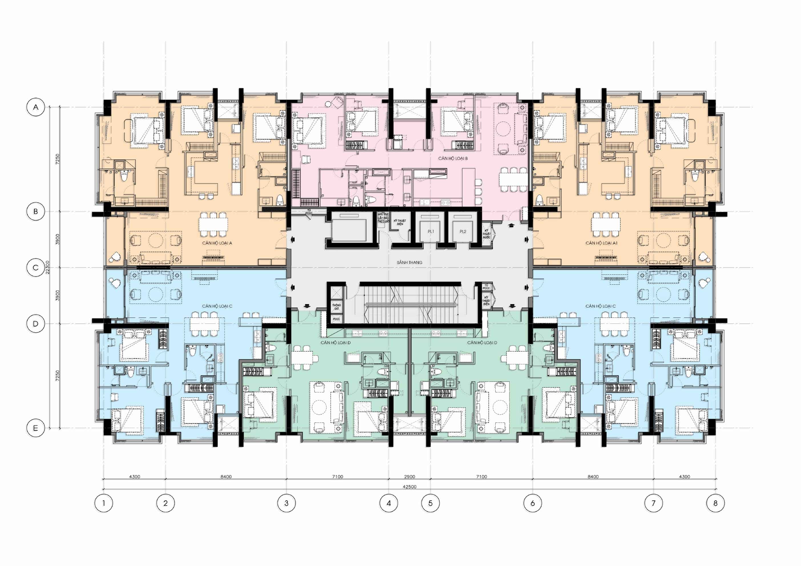 - Bố cục 7 căn/sàn: Mật độ căn hộ thấp, giúp đảm bảo không gian hành lang luôn yên tĩnh và mang lại trải nghiệm sống riêng tư cho gia chủ.