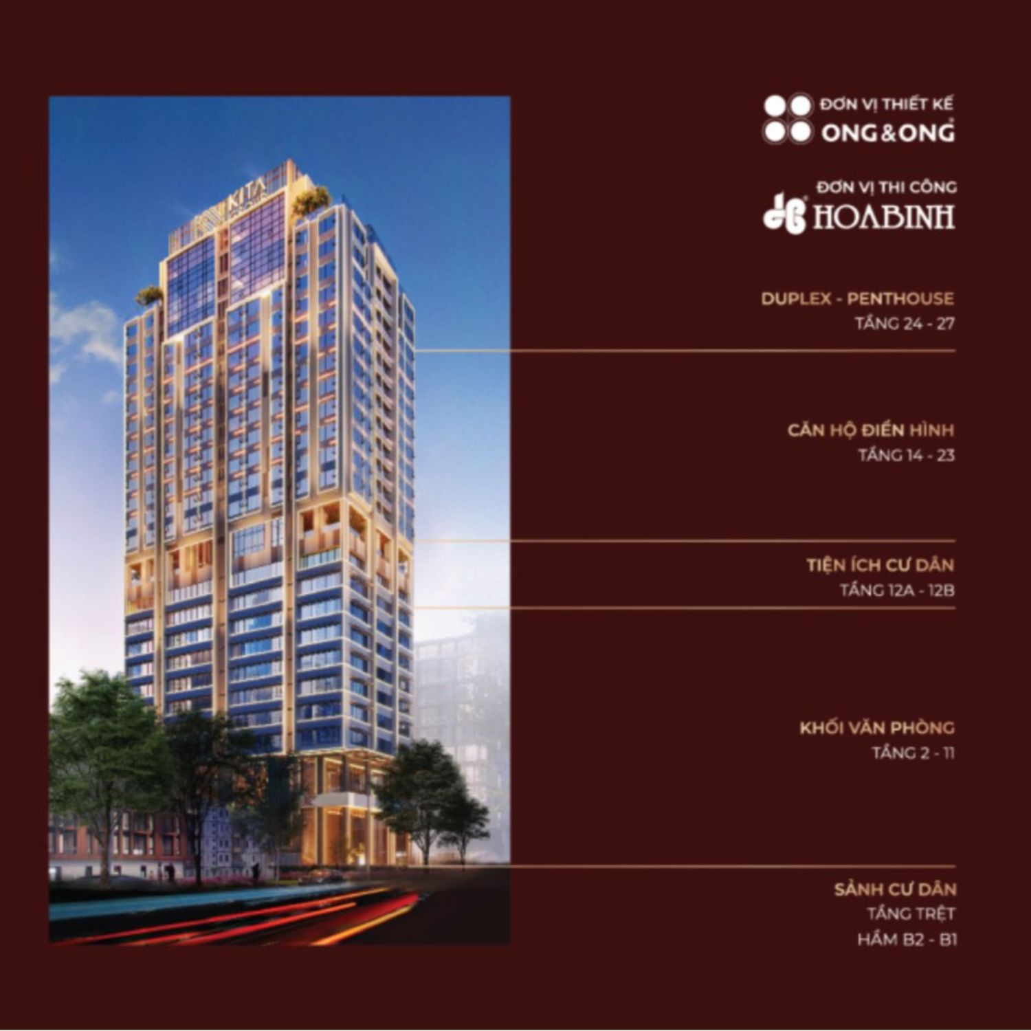 Mặt bằng dự án Kiều by Kita được thiết kế trên 1 tòa tháp 27 tầng, thể hiện rõ triết lý “luxury” (sang trọng) và “private” (riêng tư). Điểm mấu chốt là sự tách biệt hoàn toàn giữa khối đế văn phòng (tầng thấp) và khối căn hộ (tầng cao), đảm bảo an ninh và yên tĩnh tuyệt đối cho 82 chủ nhân.