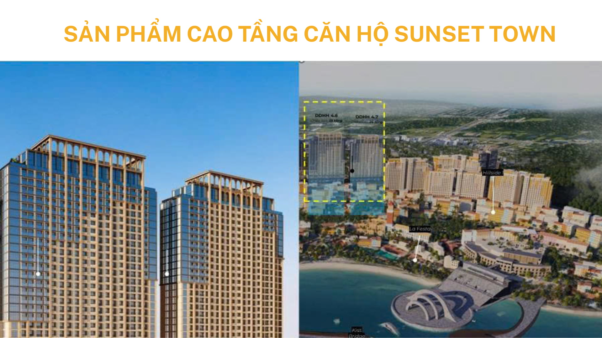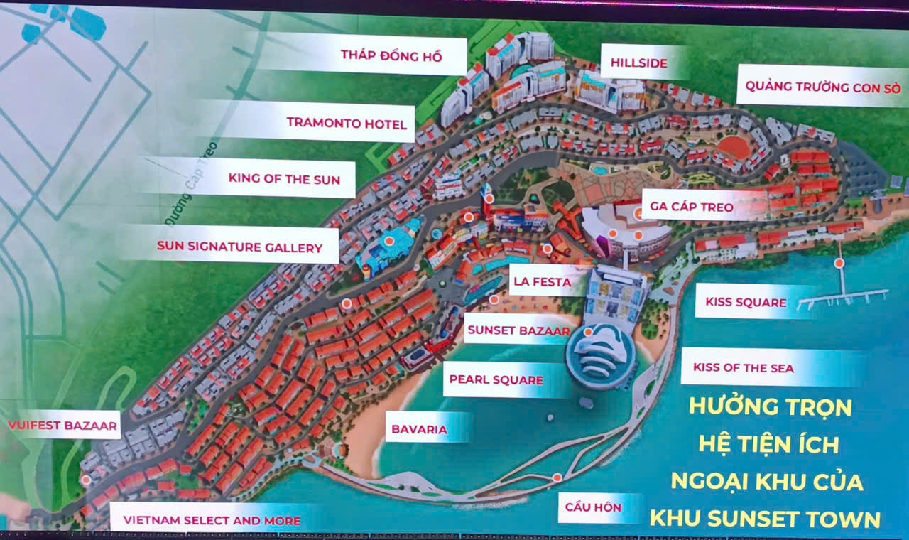 Khu vực Nam Đảo: Sunset Town, Hillside,… Sun Group có hệ sinh thái kiến trúc + giải trí + show diễn: Các công trình biểu tượng: đài phun nước kinh ngạc, cầu treo dây vượt biển dài nhất thế giới, Sunset Town… Thổi hồn vào kiến trúc và show diễn, kể câu chuyện qua từng công trình, trải nghiệm khách hàng. Sun group đầu tư 100% vốn cho các chi tiết tinh xảo, sử dụng đá marble nhập khẩu, kỹ thuật 3D, tính toán ánh sáng hoàng hôn.