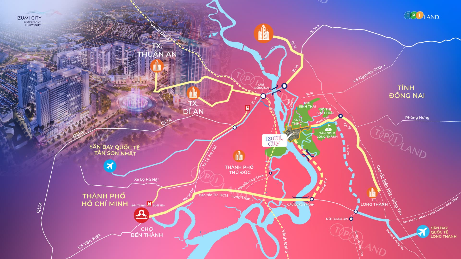 Izumi City tọa lạc tại Long Hưng – Biên Hòa, ngay trục tăng trưởng vàng phía Đông TP.HCM, sở hữu thế đất ven sông Đồng Nai hiếm có với phong thủy “địa thủy hòa sinh”.