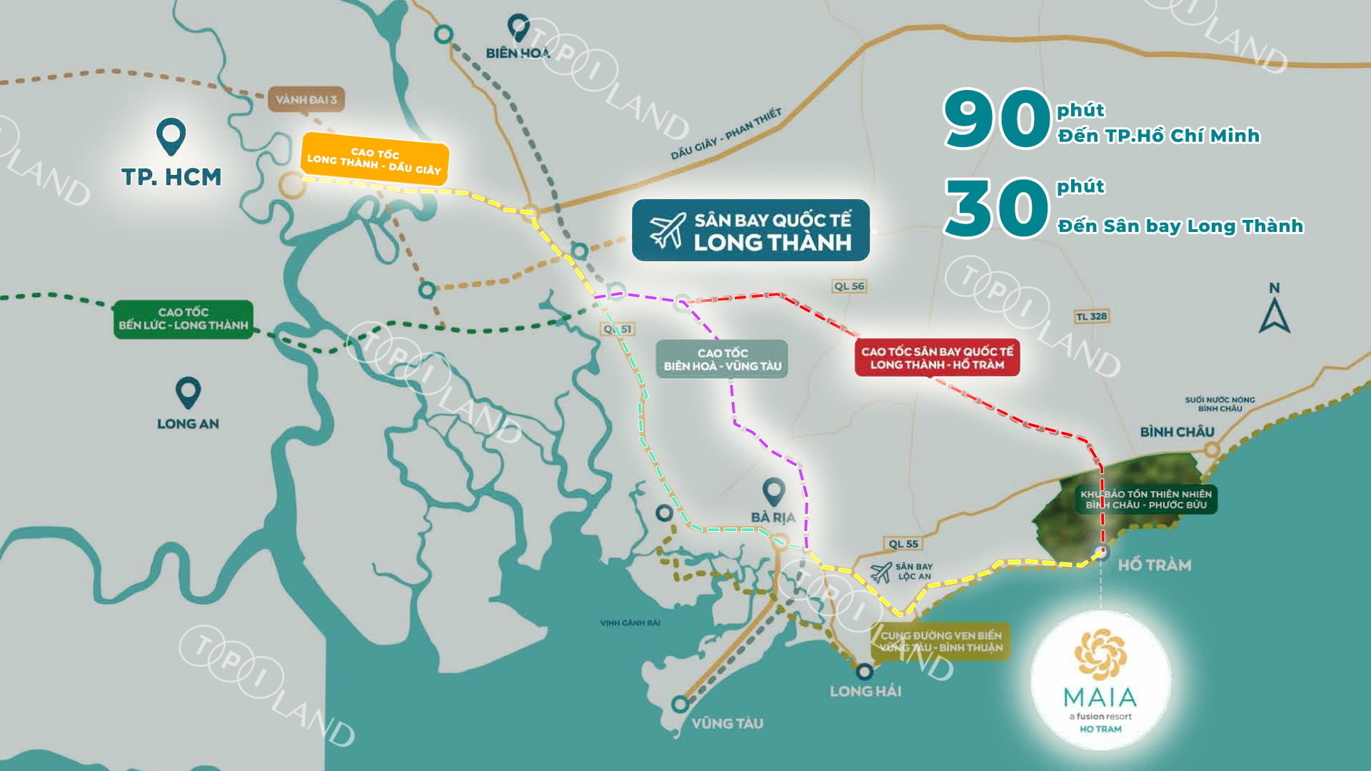 Dự án tọa lạc tại Hồ Tràm – Bà Rịa Vũng Tàu, chỉ cách TP.HCM khoảng 90 phút di chuyển qua cao tốc Long Thành – Hồ Tràm, và 41km từ Sân bay quốc tế Long Thành.