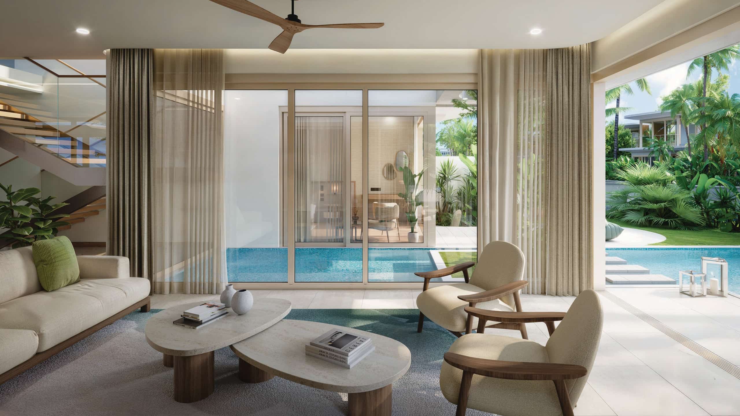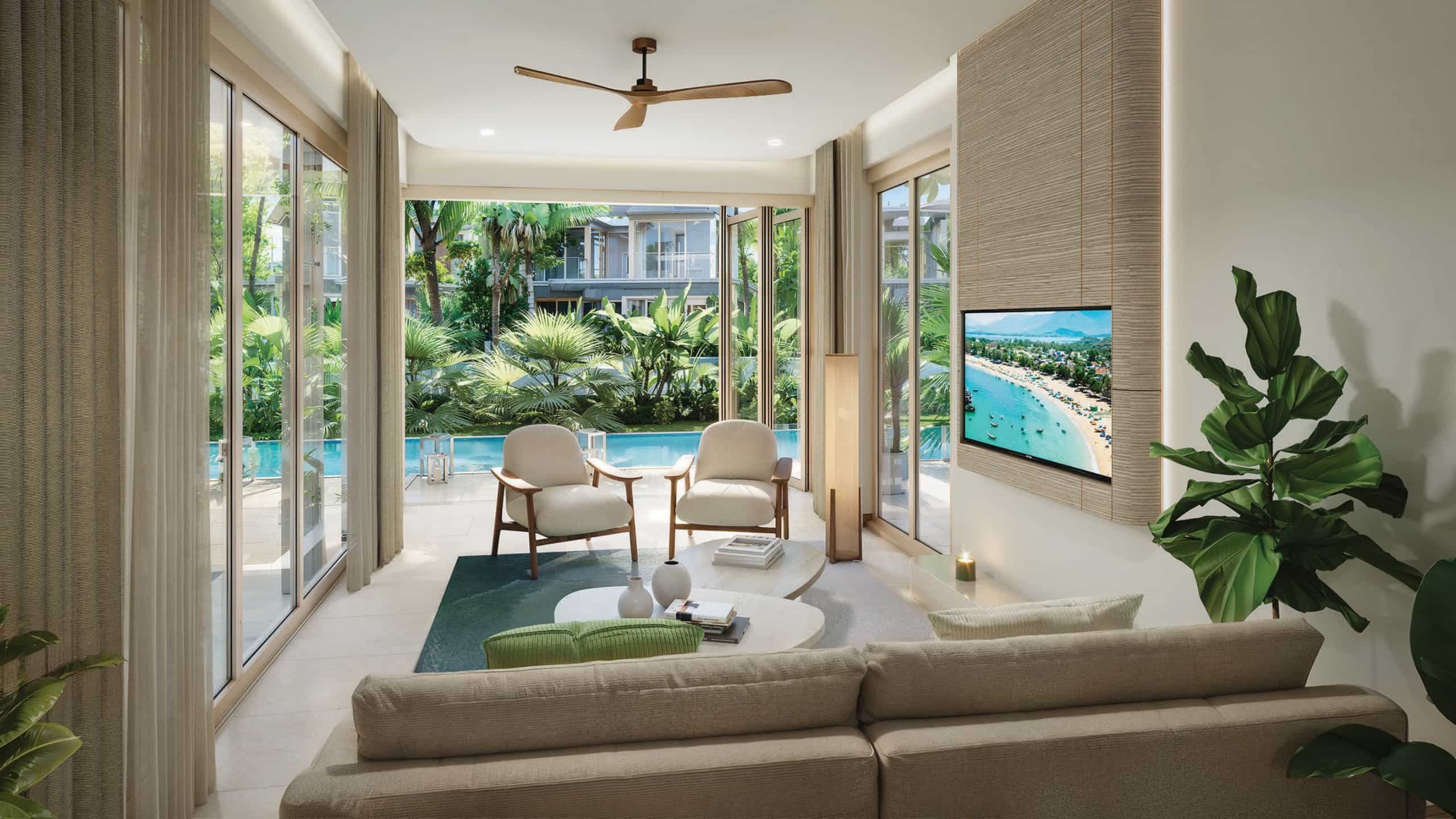 Mỗi biệt thự được thiết kế như một ốc đảo riêng tư, có xe hơi vào tận nhà, hồ bơi riêng, sân vườn xanh và không gian mở đón sáng tự nhiên. Đặc biệt, villa 3PN có hồ bơi bao quanh, mở tầm nhìn mặt nước từ phòng khách đến phòng ngủ.