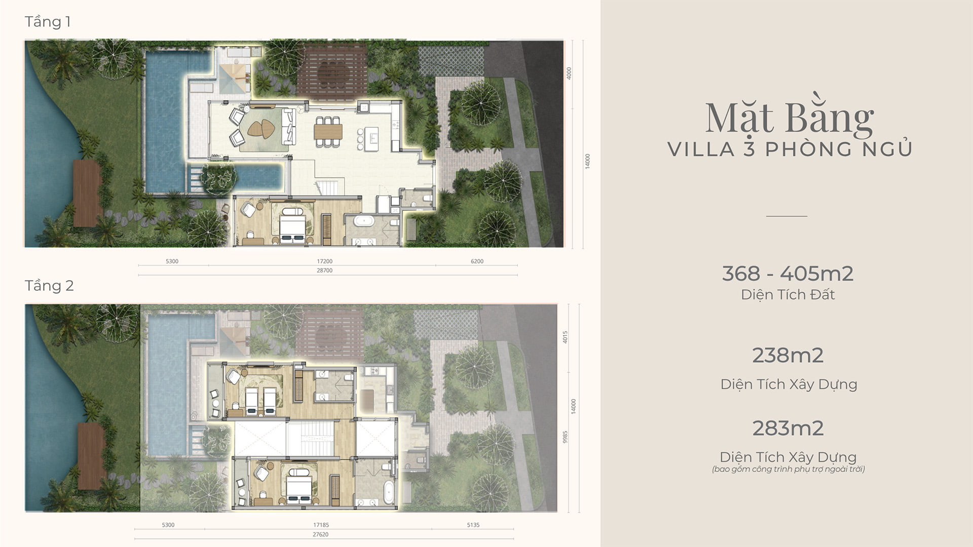 – Villa 3 phòng ngủ (283m2): 34 căn