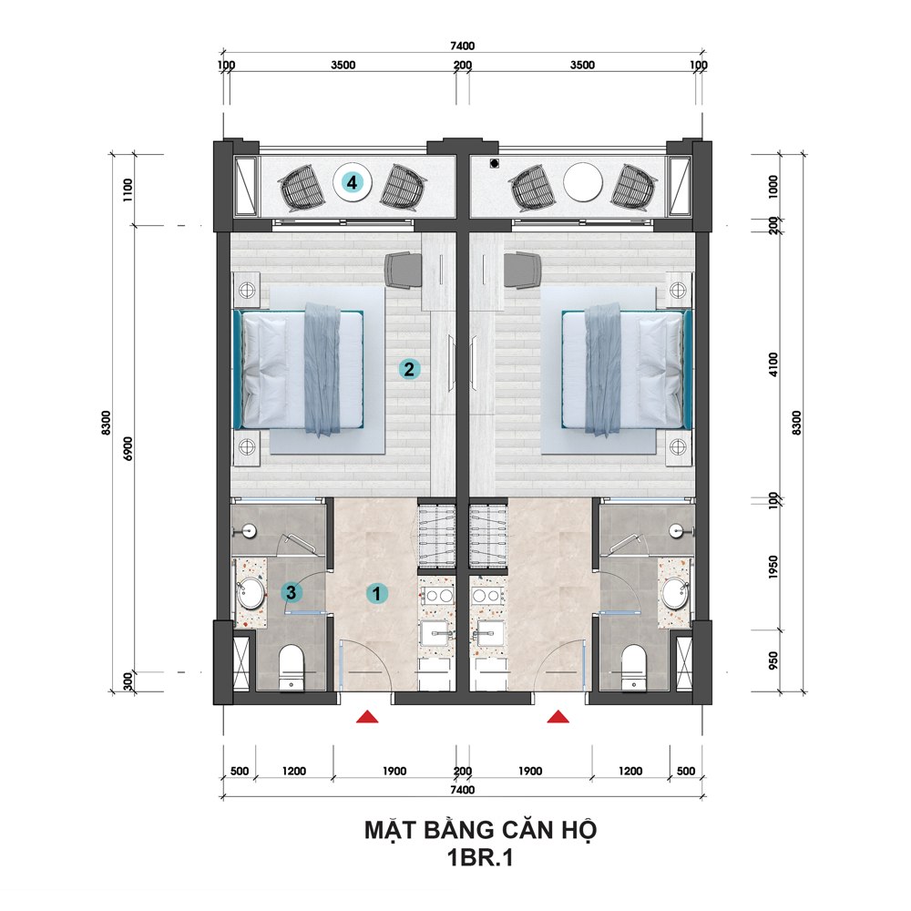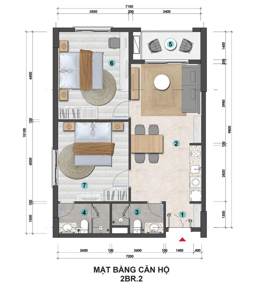 Hillside 2 tinh gọn căn 2PN xuống chỉ còn khoảng 72m² (so với 80-100m² ở Hillside 1). Hai phòng ngủ được tách biệt hoàn toàn, sử dụng phòng khách làm trung tâm kết nối, tạo cảm giác cân bằng giữa riêng tư và sinh hoạt chung.