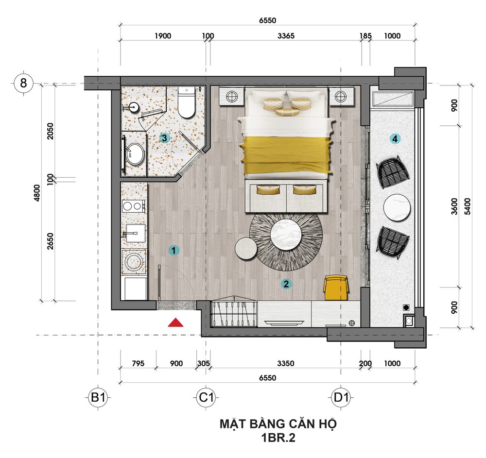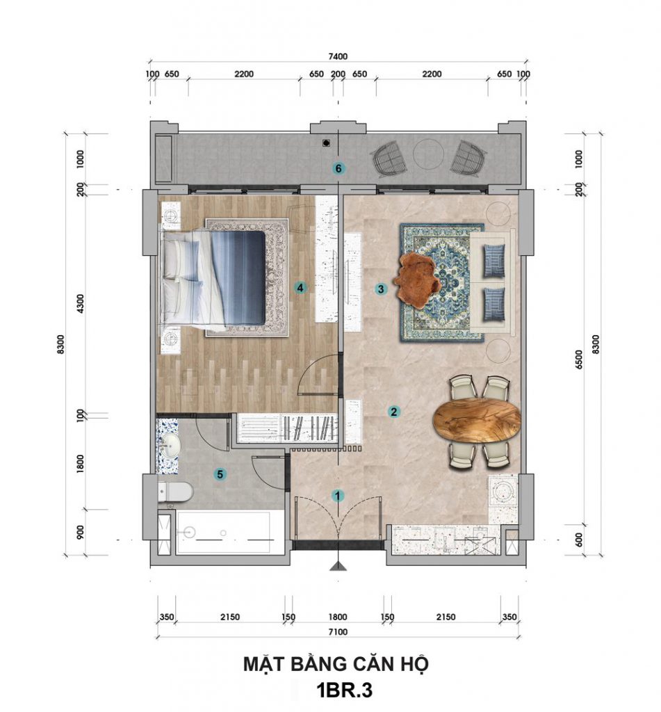 Với căn 1 phòng ngủ (khoảng 55m²), Hillside 2 đã loại bỏ hoàn toàn nhược điểm “diện tích rộng nhưng thiếu tinh gọn” của Hillside 1. Không gian được tái cấu trúc thành hai vùng rõ ràng nhưng kết nối mềm mại: